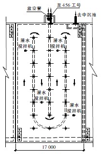 水解酸化單元由原Ⅰ、Ⅱ系列的勻質(zhì)池改造而成,增加了中沉池與污泥回流系統(tǒng);為防止污泥沉淀,在每格水解酸化池內(nèi)增加4 臺潛水推流攪拌器,其具體位置及水流方向見圖2。改造后的水解酸化池分4 格,每格尺寸為32.0 m× 16.0 m × 5.7m,有效水深為5.0 m,有效容積為2 560 m3。污水從池的頂部配水槽進入,由出水側(cè)頂部溢流排出進入中沉池。新增中沉池2 座,直徑為15.0 m,采用懸掛式中心傳動刮泥機;回流污泥采用氣提,回流比為100%;剩余污泥被污泥泵提升至污泥濃縮池。在水解酸化池和中沉池設(shè)置廢氣收集裝置。