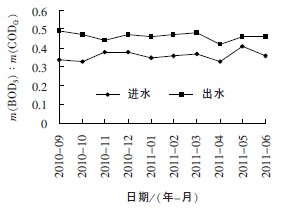 水解酸化池進、出水m(BOD5)/m(CODCr)值的變化趨勢見圖3。