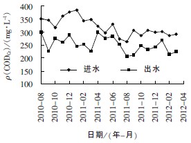 水解酸化池穩(wěn)定運行期間進、出水CODCr濃度見圖4。