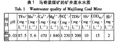 含鐵酸性礦井水是在開采高硫煤層時(shí),煤中的硫鐵礦與空氣、水及微生物作用,發(fā)生一系列物化、生化反應(yīng),使礦井水呈酸性,pH值一般為2~5。水中主要含有Fe2+、Fe3+、Mn2+、Ca2+、Mg2+、so42-及其他離子,其中Fe2+、Fe3+、、so42-是由FeS2氧化形成的,Ca2+、Mg2+是由其金屬硫化物或其可溶性鹽溶于酸性礦井水而形成的,因此硬度和礦化度均較高。該礦的礦井廢水平均排放量為4000m3/d,間歇排放,主要水質(zhì)指標(biāo)見表1。