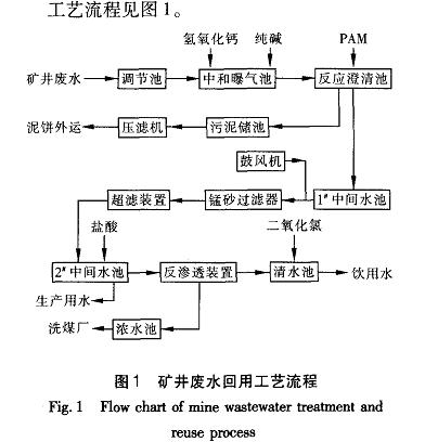 根據(jù)該礦井廢水水質(zhì)特性,經(jīng)過(guò)考察和現(xiàn)場(chǎng)中試,決定采用預(yù)處理/雙膜法處理工藝。為了實(shí)現(xiàn)水資源的綜合利用,滿足不同用戶的用水要求,采用了分質(zhì)供水方式,一是超濾處理出水直供煤礦工業(yè)用水管網(wǎng);二是超濾出水和反滲透出水按比例勾兌達(dá)到飲用水標(biāo)準(zhǔn)后送礦區(qū)生活用水管網(wǎng);三是反滲透濃鹽水送洗煤廠作補(bǔ)充水¨。