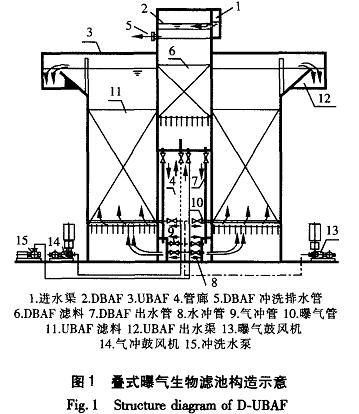 疊式曝氣生物濾池(D—UBAF)是在UBAF之前串接一級(jí)大顆粒濾料初濾池(DBAF),不進(jìn)行曝氣,主要截濾原水中的水草、塑料袋等雜質(zhì)以及無(wú)機(jī)泥砂和部分可濾SS,保障后續(xù)UBAF穩(wěn)定運(yùn)行,而UBAF是疊式曝氣生物濾池進(jìn)行生物預(yù)處理的主體。該項(xiàng)專利技術(shù)(專利號(hào):ZL200610035882.0)已經(jīng)應(yīng)用于廣州市某自來(lái)水廠的處理規(guī)模為105×101TI/d的生物預(yù)處理工程中,其構(gòu)造如圖1所示。