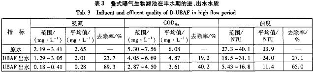 ②D—UBAF應(yīng)用于季節(jié)性高氨氮和有機(jī)物污染原水的生物預(yù)處理,發(fā)揮了DBAF與UBAF各自的特點(diǎn),使生化處理得以高效穩(wěn)定進(jìn)行。DBAF用于截留原水中的水草、塑料袋等雜質(zhì)以及無(wú)機(jī)泥砂和部分可濾SS,對(duì)UBAF起保護(hù)作用,使UBAF的反沖洗周期達(dá)到1~3d以上,微生物的數(shù)量和活性均處于較佳狀態(tài);位于DBAF之后的UBAF擁有巨大的濾料表面積,氨氮容積負(fù)荷率高,去除效果穩(wěn)定。