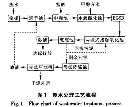 廢水經(jīng)格柵去除絕大部分懸浮顆粒物后進(jìn)入調(diào)節(jié)池,再進(jìn)入中和池,通過投加HC1調(diào)節(jié)pH值。中和池出水自流進(jìn)入廊道式水解酸化池,以改善廢水的可生化性。經(jīng)水解酸化后的廢水被泵提升至EGSB反應(yīng)器,充分降解溶解性有機(jī)物。EGSB反應(yīng)器出水進(jìn)入兩段生物接觸池進(jìn)行好氧生物處理,在二沉池內(nèi)進(jìn)行泥水分離,最后進(jìn)行砂濾處理,實(shí)現(xiàn)達(dá)標(biāo)排放。沉淀池污泥部分回流至水解酸化池或兩段生物接觸氧化池,剩余污泥進(jìn)入污泥濃縮池,濃縮污泥經(jīng)帶式壓濾機(jī)壓濾后外運(yùn)填埋。