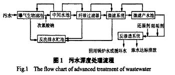 借鑒國內(nèi)各石化公司污水回用裝置實(shí)際運(yùn)行情況,并結(jié)合乙烯廠排放水水質(zhì)特點(diǎn)及現(xiàn)場(chǎng)4個(gè)月的中試情況,該化工廢水深度處理及回用工藝采用曝氣生物濾池+(微絮凝)纖維過濾+微濾+RO工藝。工藝流程如圖l所示。