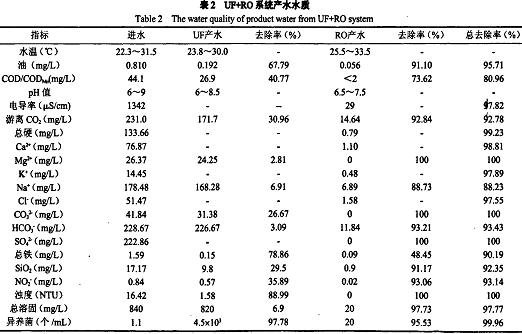 UF+RO系統(tǒng)對(duì)COD的總?cè)コ势骄禐?1.O%,油的去除率平均達(dá)95.7%,電導(dǎo)率的總?cè)コ?7.8%,二價(jià)離子去除率基本上100%,對(duì)異養(yǎng)菌的總脫除率為99.96%,脫鹽率平均97.82%。經(jīng)抗沖擊能力試驗(yàn),UF+RO對(duì)油的去除率較穩(wěn)定,不因進(jìn)水油含量的變化而變化;沖擊試驗(yàn)后,對(duì)RO進(jìn)行了化學(xué)清洗,系統(tǒng)運(yùn)行參數(shù)能夠恢復(fù)。