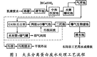 目前國內(nèi)的大豆分離蛋白生產(chǎn)廠都采用堿溶酸沉法提取分離蛋白工藝,每生產(chǎn)1t分離蛋白產(chǎn)生約30~35t的乳清廢水。乳清廢水中的有機(jī)物質(zhì)含量較高,因此對該廢水的污染防治就顯得尤為重要。但是對大豆分離蛋白廢水的污染防治,國內(nèi)外沒有統(tǒng)一的技術(shù)模式以及成功的實(shí)例可以參考,所以筆者結(jié)合自己的工作實(shí)踐探討了適宜的大豆分離蛋白廢水的處理工藝.以使處理廢水達(dá)到國家要求的《污水綜合排放標(biāo)準(zhǔn)》(GB8978--1996)二級標(biāo)準(zhǔn)。