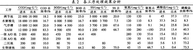 各工序?qū)ξ廴疚锏娜コЧ姳?。由表2可以看出,目前該廠的廢水處理工藝對大豆分離蛋白廢水的COD總?cè)コ士蛇_(dá)99.6%,BOD總?cè)コ蔬_(dá)99.7%.SS總?cè)コ蔬_(dá)99.6%。氨氮總?cè)コ蔬_(dá)94.6%,磷酸鹽總?cè)コ蔬_(dá)99.1%。