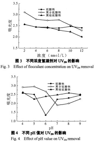UV254為腐殖質(zhì)和各種芳香族化合物含量的代表參數(shù)。圖3和圖4分別顯示了絮凝對(duì)UV254吸光度的影響。圖3表明,硫酸鐵的UV254吸光度隨絮凝劑濃度變化不大,聚合硫酸鐵和聚硅硫酸鐵的UV254吸光度隨著絮凝劑濃度的增加而逐漸降低,聚合硫酸鐵的UV254的吸光度高于另兩種絮凝劑。由于UV254和有機(jī)物的含量密切相關(guān)。因此,對(duì)于聚合硫酸鐵和聚硅硫酸鐵,隨著絮凝劑濃度的增加,垃圾滲濾液中有機(jī)物的含量降低,在相同濃度條件下,聚硅硫酸鐵對(duì)有機(jī)污染物的去除率要好于聚合硫酸鐵。