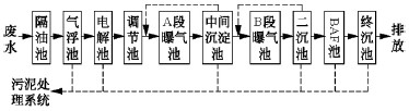 如圖1所示,廢水首先由各車(chē)間匯入隔油池除去浮油,隔油池兼起水量和水質(zhì)調(diào)節(jié)作用;然后由泵提升至氣浮池,通過(guò)加入PAC絮凝劑除去廢水中的乳化油;氣浮出水通過(guò)電解池中電濾機(jī)進(jìn)行電解,電解池出水進(jìn)入調(diào)節(jié)池,通過(guò)投加10%的稀硫酸調(diào)節(jié)pH至6.5~7.8;再進(jìn)入生物吸附和曝氣生物濾池(BAF)進(jìn)行生化處理,出水最終經(jīng)終沉池達(dá)標(biāo)排放。其中隔油池上層廢油定期回收;氣浮和電解的浮渣及生化產(chǎn)生的剩余污泥經(jīng)污泥處理系統(tǒng)中板框壓濾機(jī)脫水后泥餅外運(yùn),壓濾機(jī)濾液經(jīng)管道回流至隔油池。