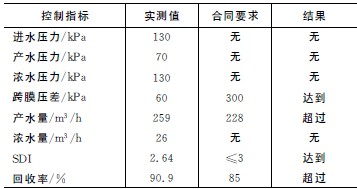 該工程于2011年9月1日開始調試,2012年3月底順利通過業(yè)主驗收,持續(xù)7個月的調試運行歷經(jīng)進水水質波動、水廠前三期輸水總管爆管導致極大的產(chǎn)水壓力等困難,通過調整系統(tǒng)參數(shù)和超濾反滲透的清洗方案,以達到最佳的運行效果。