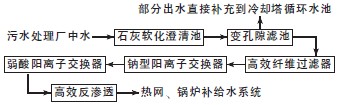對市政污水廠出水進(jìn)行深度處理,使其可回用作為電廠循環(huán)冷卻水系統(tǒng)的補(bǔ)水和鍋爐補(bǔ)給水,常用工藝包括石灰澄清軟化法、超濾/微濾/MBR 聯(lián)合反滲透/納濾法、離子交換法、生化法等[2-3]。由于該污水CODCr、NH3-N、SS 濃度、硬度及堿度都較高,因此,石灰澄清軟化是唯一可行的、最經(jīng)濟(jì)的預(yù)處理辦法;高效反滲透技術(shù)能有效解決有機(jī)物污染和微生物滋生的問題,并且能實現(xiàn)較高的回收率、脫鹽率和系統(tǒng)的經(jīng)濟(jì)、穩(wěn)定運(yùn)行[4]。經(jīng)過技術(shù)經(jīng)濟(jì)比較,確定深度處理工藝流程如圖1 所示。