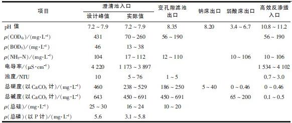 由2 座直徑為10 m的機(jī)械攪拌澄清池和5 座變孔隙濾池組成,機(jī)械攪拌澄清池單座設(shè)計出力為850 m3/h,變孔隙濾池單座設(shè)計出力為300 m3/h,濾速為7~12 m/h,調(diào)整石灰投加量為300 ~ 400mg/L,控制出水pH 值為10.0 ~ 10.5,聚鐵投加量為20 ~ 40 mg/L,PAM 投加量為0.5 ~ 1.0 mg/L,該系統(tǒng)能去除來水中大部分的SS 和膠體物質(zhì)、約30%的CODCr和90%的暫時硬度,利用硫酸調(diào)節(jié)pH 值至8.3 ~ 8.5,變孔隙濾池出水濁度降低至2 ~5 NTU,部分出水可直接補(bǔ)充到冷卻塔循環(huán)水池。