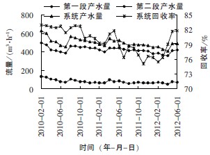 從2010 年1 月到2012 年6 月,系統(tǒng)經(jīng)歷了3次化學(xué)清洗,系統(tǒng)通量得到了一定程度的恢復(fù),從2010 年1 月至7 月,系統(tǒng)的出力下降很快,這主要是因為來水水質(zhì)劇烈波動,使得進(jìn)入反滲透系統(tǒng)的污水濁度和硬度偶爾超標(biāo),反滲透膜受到一定程度的污染,在3 a的運(yùn)行時間里,系統(tǒng)的出力總體來說比較穩(wěn)定,系統(tǒng)的產(chǎn)水量從最初的630 m3/h降低到486.8 m3/h,系統(tǒng)的回收率一直維持在75%以上。