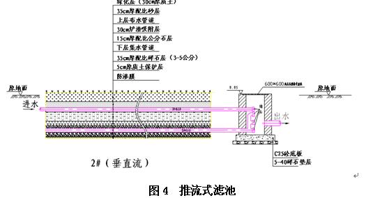 布水管和集水管分設(shè)在池的兩端,池內(nèi)兩邊是4-5公分的碎石,中間部分是多介質(zhì)層,由下往上依次為2mm厚塑料薄膜、公分石、砂層、綠化層,污水以推流的方式從左往右流動(dòng),一次經(jīng)過碎石層、多介質(zhì)層、碎石層,最后由右邊碎石層中集水管收集后流入垂流式濾池。垂流式濾池剖面圖(如圖5所示)