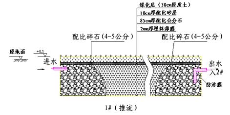 多介質(zhì)層由下往上依次為防滲膜、原質(zhì)土保護(hù)層、碎石層、下層集水管道、公分石層、爐渣吸附層、上層布水管道、砂層、綠化層。污水進(jìn)入垂流式濾池后,由上層布水管道進(jìn)行向下布水,污水由于重力作用流經(jīng)爐渣吸附層、公分石層后,由下層集水管道收集后流出垂流式濾池,達(dá)標(biāo)排放。