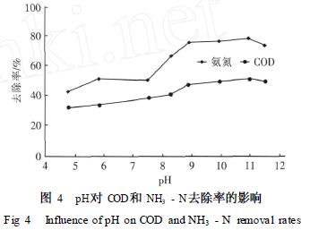 用2 mol/L的NaOH溶液和10%的硫酸調(diào)節(jié)廢水的pH,考察pH對(duì)COD和NH3 - N 去除率的影響,結(jié)果見(jiàn)圖4。