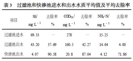 在本工程運行過程中,由于工廠總排污口的污水濃度和水量均很不穩(wěn)定,因此,無法評價預沉調(diào)節(jié)池對污染物的處理效果。但污水在預沉調(diào)節(jié)池中的停留時間一般不低于12 h ,其出水水質(zhì)相對較穩(wěn)定。為進一步討論過濾池和快滲池的作用,對過濾池的出水水質(zhì)也進行了系統(tǒng)監(jiān)測,其結果見表3 (其中,SS 為6次分析結果的平均值;CODCr 和NH32N 為4 次分析結果的平均值) 。