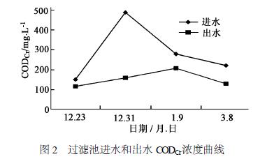 (3) 增強系統(tǒng)抗負荷沖擊能力。圖2 是過濾池進水和出水CODCr濃度隨時間曲線,從圖中可以看出,過濾池的進水濃度波動較大,而其出水濃度相對較穩(wěn)定,從而保證了快滲池具有穩(wěn)定的出水水質(zhì)。