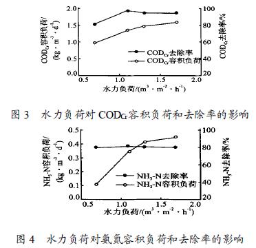 ( 2) 當(dāng)水力負(fù)荷在0. 7 ~ 1. 7 m3/ ( m2# h) 范圍內(nèi)變化時(shí), CODCr和氨氮的容積負(fù)荷均隨水力負(fù)荷的增加而增加。水力負(fù)荷的變化對(duì)氨氮去除率的影響較小。