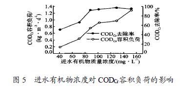 ( 3) 反應(yīng)器CODCr容積負(fù)荷隨進(jìn)水有機(jī)物濃度的增加而增加。受氣水比的限制, 當(dāng)進(jìn)水有機(jī)物質(zhì)量濃度超過128 mg/ L 時(shí), 有機(jī)物去除率略有下降。