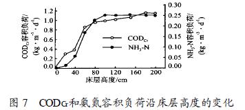 當(dāng)碳氧化和硝化在同一反應(yīng)器中進(jìn)行時(shí), 由于氧化有機(jī)物的異養(yǎng)菌和硝化氨氮的自養(yǎng)菌間要競爭生物膜表面空間和溶解氧, 因此在不同床層高度處氧化有機(jī)物和硝化氨氮的能力也不同152, 容積負(fù)荷和氨氮負(fù)荷沿床層高度的變化見圖7。其中進(jìn)水有機(jī)物質(zhì)量濃度和氨氮質(zhì)量濃度分別為122. 11 mg/ L和26. 9 mg/ L, 濾速為1. 04 m/ h, 氣水比為3÷1。