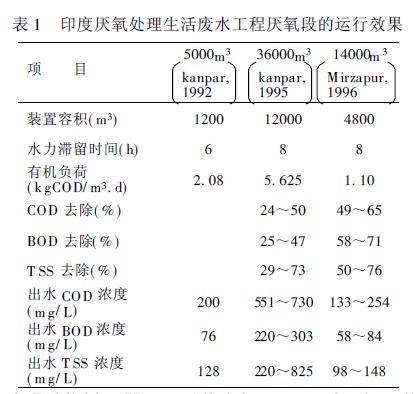 根據(jù)印荷合作計劃, 之后又分別建成了生活污水日處理量分別為: 14000m3 裝置( 印度Mir zapur 地區(qū), 其中有1/ 4 來自制革廢水) ,36000m3 裝置( 印度Kanpar 地區(qū)) , 和50000m3 裝置( 印度Hy derabad 地區(qū)) 。從表1 可以看出, 這些裝置的運行情況,有機(jī)物去除率都顯然不高。裝置中也幾乎都沒有形成所希望的顆粒污泥。