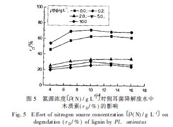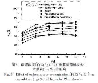 實(shí)驗(yàn)結(jié)果表明( 圖3) , 葡萄糖質(zhì)量濃度為1. 0 g/ L 和10. 0g / L 時(shí)木質(zhì)素降解率大致相同, 在d 10 時(shí), 木質(zhì)素降解率分別為68%和67%, 木質(zhì)素含量從920 mg/ L 分別降低至294 mg/L 和304 mg/ L. 但在d 7 時(shí), 1. 0 g/ L 條件下已有65%的木質(zhì)素降解, 而10. 0 g/ L 時(shí)木質(zhì)素降解率為58%, 說(shuō)明在1. 0 g/ L條件下不僅降解率高而且降解速率較快. 隨后降解率的提高不甚明顯. 葡萄糖濃度為20. 0 g/ L 和50. 0 g/ L 時(shí), 木質(zhì)素降解率明顯下降. 同時(shí)注意到, 在不添加碳氮源的情況下, 有無(wú)機(jī)鹽存在時(shí)木質(zhì)素降解率可達(dá)58%, 沒(méi)有無(wú)機(jī)鹽時(shí)木質(zhì)素降解率只有45%, 這一方面表明無(wú)機(jī)鹽對(duì)木質(zhì)素的降解起著重要作用, 另一方面也表明白腐真菌可以利用廢水本身所含的某些物質(zhì)生長(zhǎng)并分泌木質(zhì)素降解酶. 當(dāng)僅僅不添加碳源( 0 g/ L 的情況) 時(shí), 木質(zhì)素降解率只低于1. 0 g/ L 和10. 0 g/ L 條件下的木質(zhì)素降解率, 而比其他濃度條件下的木質(zhì)素降解率都要高. 這說(shuō)明白腐真菌雖然可以利用廢水本身所含的某些物質(zhì)生長(zhǎng), 但在廢水中添加適量的碳源對(duì)于木質(zhì)素降解率的提高是非常必要的, 而過(guò)多的碳源顯然不利于木質(zhì)素的有效降解.