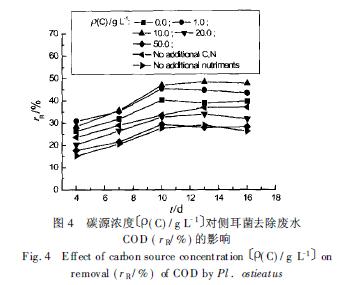 3. 2 在廢水培養(yǎng)基中添加適量的碳源( 葡萄糖) 和氮源( 酒石酸銨) 有利于木質(zhì)素的降解和COD 的去除, 但過(guò)量的碳氮源反而導(dǎo)致木質(zhì)素降解率和COD 去除率的下降. 以側(cè)耳菌為實(shí)驗(yàn)菌株, 在pH 6. 0 的廢水中添加1. 0 g/ L 的葡萄糖和0. 2 g/ L的酒石酸銨處理效果最佳.