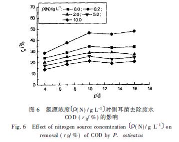 由圖可見(jiàn), 酒石酸銨濃度的大小對(duì)黑液廢水的處理效果有較大影響. 當(dāng)不添加氮源時(shí), 木質(zhì)素降解率和COD 去除率分別為63%和35%; 隨著酒石酸銨的濃度增大至0. 2 g/ L, 木質(zhì)素降解率和COD 去除率分別增大至70%和48%, 木質(zhì)素可從925 mg/ L 降為278 mg/ L,( COD) 可從4 570 mg/ L 降為2 376 mg/ L; 繼續(xù)增大氮源濃度至2. 0 g/ L 時(shí), 木質(zhì)素降解率和COD 去除率均顯著下降, 僅為34%和29%; 當(dāng)酒石酸銨濃度增大到10. 0 g/ L 時(shí), 木質(zhì)素降解率僅為27%, COD 去除率也僅為21%. 由此可見(jiàn), 適量添加氮源能夠有效地提高側(cè)耳菌對(duì)黑液廢水的處理效果, 但過(guò)量的氮源可能會(huì)抑制木質(zhì)素降解酶的分泌, 因而抑制側(cè)耳菌對(duì)木質(zhì)素的降解作用, 從而影響黑液廢水的處理效果.側(cè)耳菌在黑液廢水中的掛膜生長(zhǎng)情況與上述木質(zhì)素降解情況基本一致, 在0 g/ L 和0. 2 g/ L 的氮源濃度下, 生物膜生長(zhǎng)良好, 生長(zhǎng)量大, 掛膜快, 4~ 5 d 時(shí)基本完成掛膜. 而在其它濃度條件下, 生物量較少, 掛膜量小. 因此選擇0. 2 g/ L 的酒石酸銨濃度較適宜.在上述考察外加碳氮源影響的實(shí)驗(yàn)中, 隨著葡萄糖和酒石酸銨濃度的增大, 黑液廢水的初始COD 也相應(yīng)增大, 但由于微生物在生長(zhǎng)過(guò)程中是不斷消耗碳氮源的, 因此難以將黑液本身的COD 與碳氮源所占的COD 區(qū)分開(kāi)來(lái). 故在本實(shí)驗(yàn)中仍以總COD 去除率來(lái)計(jì)算.