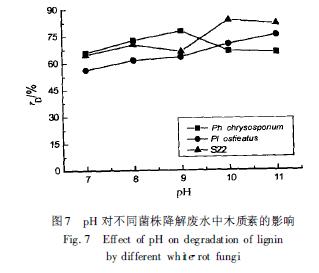 由圖7 和圖8 可見(jiàn), 當(dāng)廢水培養(yǎng)基的pH 在7. 0~ 9. 0 范圍內(nèi)時(shí), 黃孢原毛平革菌對(duì)黑液廢水的處理效果最佳, 木質(zhì)素降解率和COD 去除率分別可達(dá)78%( pH 9. 0) 和65%( pH 8. 0) .在pH 10. 0 和pH 11. 0 條件下, 則以S22 菌株對(duì)黑液廢水的處理效果最好, 木質(zhì)素降解率和COD 去除率分別可達(dá)84% ( pH10) 和69%( pH 10) , 木質(zhì)素可從960 mg/ L 降為154 mg/ L, ( COD) 可從4 850 mg/ L 降為1 504 mg/ L. 有文獻(xiàn)報(bào)道Ox ysp orus sp. 和Pl. chrysosp or ium 能夠降解木質(zhì)素, 它們的木質(zhì)素降解率分別為70%和60%[ 14] , 均低于上述實(shí)驗(yàn)結(jié)果. 此結(jié)果表明, 這3 種菌株在較強(qiáng)的堿性環(huán)境中都能顯著地降解木質(zhì)素和去除COD, 同時(shí)掛膜生長(zhǎng)的情況表明它們?cè)趬A性條件下均能生長(zhǎng)掛膜. 但每種菌株生長(zhǎng)的適宜pH 是不同的, 黃孢原毛平革菌和側(cè)耳菌在pH 7. 0, pH 8. 0 和pH 9. 0 條件下生長(zhǎng)掛膜比較好, pH 10. 0 和pH 11. 0 時(shí)次之。而S22 菌株在pH 8. 0~10. 0 范圍內(nèi)生長(zhǎng)掛膜的情況差不多, pH 11. 0 時(shí)稍差一些. 由于造紙黑液廢水是強(qiáng)堿性的, 因此這3 株白腐真菌能夠在堿性環(huán)境中生長(zhǎng)掛膜并降解木質(zhì)素的獨(dú)特優(yōu)勢(shì), 為以生物技術(shù)治理造紙黑液的進(jìn)一步研究奠定了基礎(chǔ). 白腐真菌在堿性環(huán)境中的這種生長(zhǎng)與降解木質(zhì)素的能力尚未見(jiàn)報(bào)道.