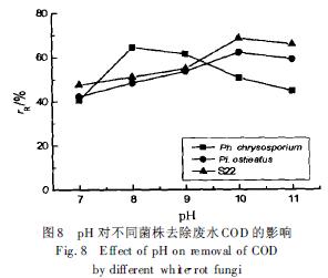 3. 4 黃孢原毛平革菌、側(cè)耳菌和S22 菌株在堿性較強(qiáng)的廢水中也能生長(zhǎng)掛膜, 其中S22 菌在pH 10. 0 時(shí)木質(zhì)素降解率和COD 去除率最高, 分別達(dá)84%和69%. 表明白腐真菌具有對(duì)造紙黑液廢水的適應(yīng)能力以及顯著降解廢水中木素等污染物質(zhì)的能力.