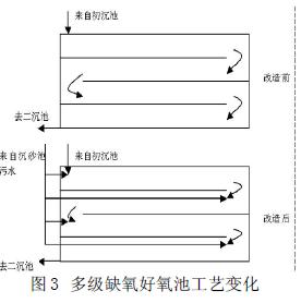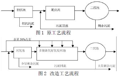 污泥回流至厭氧池之前,污泥回流比根據(jù)運行調(diào)試控制在30~60%之間;厭氧池配水量為總進(jìn)水量的50% 左右,其余部分分為四次配入后續(xù)多級缺氧好氧池中;多級缺氧好氧池由一次配水改為四次配水,由一級完全混合改為四級完全混合串聯(lián)運行,改造前后進(jìn)水方法見下圖:大量剩余污泥由二沉池排出,少量污泥由厭氧池排出; 污泥在多級缺氧好氧池處于缺氧- 好氧的反復(fù)交替反應(yīng)中。
