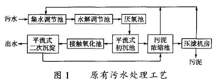 (1)造紙廠由草漿造紙改為再生造紙工藝后,為利用原有廢水處理設(shè)備及構(gòu)筑物,在小試基礎(chǔ)上確定了以下處理工藝:進(jìn)水一集水調(diào)節(jié)池一初沉池一接觸氧化池一二沉池一出水,由于新工藝排水量。佑|氧化池僅用1座就可以達(dá)到處理要求,調(diào)節(jié)池提升泵采用1臺(tái)110m 離心泵抽水,工藝連續(xù)運(yùn)行,曝氣機(jī)24h曝氣。
