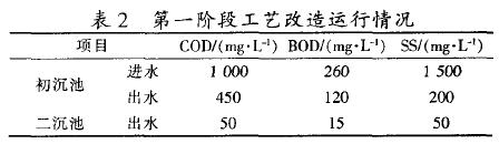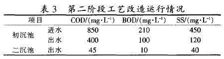 (3)運(yùn)行成本:初沉池加的藥品為PAC,加藥質(zhì)量濃度250 m L。實(shí)際處理水量l 600 m3/d,則處理廢水的費(fèi)用為0.7元/m。。第一階段工藝改造運(yùn)行情況如表2所示: