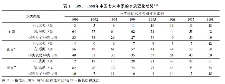 用水逐年增長, 水資源浪費(fèi)嚴(yán)重。據(jù)統(tǒng)計, 自1949) 2002年, 全國用水量增加了4 000多億m3,大約每10 年增加1 000 億m3, 年平均增加約為100億m3。1980年以后, 全國總用水量的增長幅度略有下降, 但年平均增長量仍為62億m3 左右。農(nóng)田灌溉多沿用傳統(tǒng)方式, 灌溉利用系數(shù)在0. 45左右, 至少有一半的水被浪費(fèi)。工業(yè)用水利用率也很低, 發(fā)達(dá)國家的萬元GDP 用水量一般在50 m3,而中國的萬元GDP用水量卻在730 m3。水質(zhì)不容樂觀, 2006年, 中國廢水排放總量達(dá)到536. 8億,t 其中工業(yè)廢水為240. 2億,t 占排放總量的44. 7% 。廢水排放居于前四位的行業(yè)依次為造紙、化工、電力和紡織, 這四個行業(yè)排放的廢水占重點(diǎn)統(tǒng)計企業(yè)廢水排放量的53. 9%。表1列出了1991) 1998年中國七大水系的水質(zhì)變化趨勢。