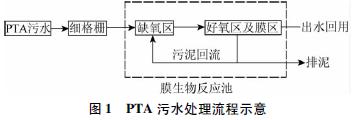 某石化廠PTA 污水采用膜生物反應(yīng)器和厭氧好氧循環(huán)運(yùn)行的處理工藝,處理后出水基本可以達(dá)到循環(huán)水補(bǔ)水的要求,直接回用于循環(huán)水補(bǔ)充水系統(tǒng)[4]。其處理流程見圖1 所示。