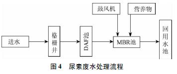 (2) 開封某化工廠主要有合成氨、尿素等產(chǎn)品。尿素工程包括造氣、變換、脫硫、精脫硫、壓縮、甲醇煉化、氨合成、冷凍、氫氨回收、甲醇精餾、甲醇罐區(qū)、液氨罐區(qū)、主裝置、CO2壓縮、尿素包裝及成品庫、造粒塔和鍋爐房。廢水處理量為5 000 m3 /d,采用工藝為格柵+ DAF +MBR。于2007 年7 月建成。其污水處理流程見圖4。