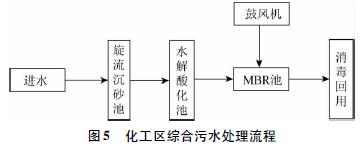 ( 3) 廣東惠州某化工廠綜合污水處理廠采用沉砂- 水解酸化- MBR 處理工藝,處理水量為25 000 m3 /d。于2007 年7 月建成,可節(jié)約新鮮水900 × 104 m3 /a。其處理流程見圖5。