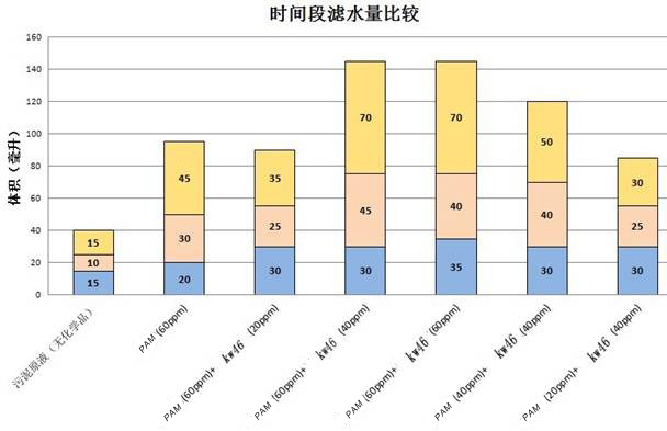KW46和絮凝劑PAM搭配使用的時(shí)間段濾液體積數(shù)據(jù)對比