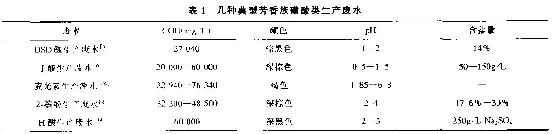表1為幾種典型芳香磺酸類有機化工生產廢水的水質。該類廢水具有以下幾個主要特征。