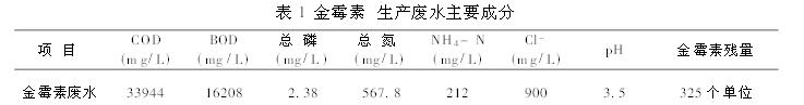 1.1廢水水質(zhì)試驗(yàn)用金霉素生產(chǎn)廢水取自福建浦城生化廠,冷藏備用。主要成份見表1。