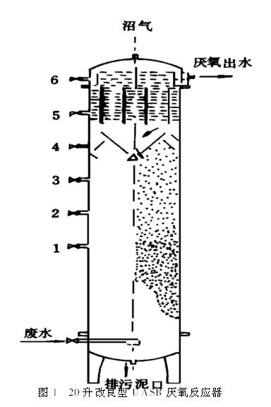 厭氧反應(yīng)器由布水器,污泥床,懸浮污泥層,三相分離器,截留過濾層和氣室等6個部分組成。裝置容積20升,整個厭氧消化裝置置于38℃的大型恒溫箱內(nèi),進(jìn)水由電子微量泵提升,連續(xù)運(yùn)轉(zhuǎn)作業(yè)。工藝流程見圖2。