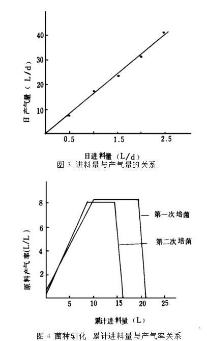 (2)接種污泥的馴化受底物濃度的影響較大,本試驗(yàn)第一期結(jié)果表明,當(dāng)累計進(jìn)料21.2升時,即馴化第10天,產(chǎn)氣量開始下降,至第11天,菌種活性受到抑制,基本不產(chǎn)氣。第二期也有類似結(jié)果,當(dāng)累計進(jìn)料15.9升時,又重復(fù)出現(xiàn)上述抑制現(xiàn)象。