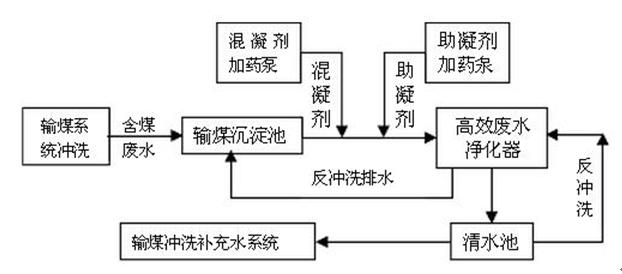 根據(jù)調(diào)查,在設(shè)計(jì)上,大多數(shù)燃煤電廠含煤廢水傳統(tǒng)的處理工藝是將含煤廢水排至輸煤沉淀池中進(jìn)行簡單地沉淀處理,出水直接回收用于輸煤系統(tǒng)沖洗補(bǔ)充水或排入生產(chǎn)廢水處理站進(jìn)行再處理后回用。其處理流程如下: