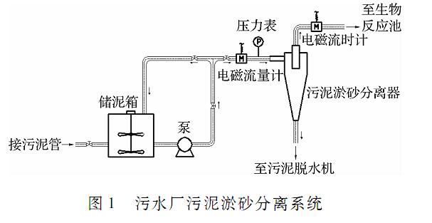 污水廠污泥淤砂分離系統(tǒng)如圖1所示,核心設(shè)備為自主開(kāi)發(fā)的污泥淤砂分離器。實(shí)驗(yàn)時(shí),先將污水廠回流污泥泵入帶攪拌器的儲(chǔ)泥箱,通過(guò)調(diào)節(jié)閥門(mén)控制污泥混合液進(jìn)入污泥淤砂分離器的壓力,污泥混合液通過(guò)分離器后被分離為底流污泥和溢流污泥。其中,底流污泥被輸送至污泥脫水機(jī)進(jìn)行脫水,溢流污泥被回流至生物反應(yīng)池。