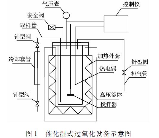 實(shí)驗(yàn)裝置主體由1.0L高壓反應(yīng)釜(威海匯鑫化工機(jī)械有限公司制造)和控制儀組成,設(shè)計(jì)最大反應(yīng)壓力和最高溫度分別為20MPa和350°C。反應(yīng)釜內(nèi)配備攪拌器(最大轉(zhuǎn)速為1500r/min)和取樣裝置,取樣口連通釜內(nèi)插底管,管口配針型閥,在針型閥后加裝一個(gè)不銹鋼的蛇形盤(pán)管,以提高取樣的可操作性和穩(wěn)定性?刂苾x可以顯示并控制反應(yīng)釜內(nèi)的溫度和壓力,催化濕式過(guò)氧化設(shè)備示意圖見(jiàn)圖1。