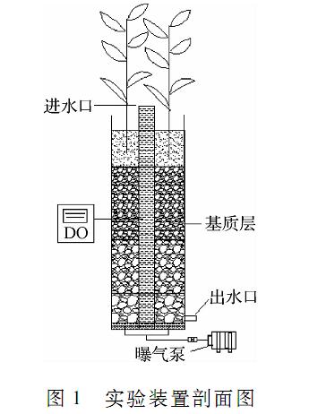 實驗采用潛流人工濕地小試裝置,如圖1所示。尺寸為60cm*20cm(高*直徑),濕地內(nèi)基質(zhì)分為2層,表層為10cm厚的砂子(粒徑<2mm),底層為50cm厚的礫石,礫石粒徑從下到上逐漸減小,以提高曝氣時氧氣的利用率。選用的濕地植物蘆葦為多年生草本挺水植物,是北方較為常見的濕地植物,種植密度約為每個裝置8株。進水為人工配水,用蔗糖、硫酸銨和磷酸二氫鉀模擬配制生活污水,水質(zhì)特征如表1所示。系統(tǒng)運行采用人工批次進水,每個系統(tǒng)每周期初始同時迅速注入6l污水,污水在系統(tǒng)內(nèi)停留3d后排出。