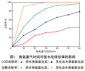 b)當(dāng)臭氧的質(zhì)量濃度20 mg/L、臭氧進(jìn)氣流量1.5 L/min、臭氧通氣時(shí)間30 min時(shí),臭氧氧化工序的COD平均去除率達(dá)到30.0%~40.0%,總酚去除率達(dá)到100.0%。