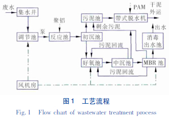生產(chǎn)廢水和生活污水進(jìn)入集水井,經(jīng)集水井內(nèi)粗格柵和轉(zhuǎn)鼓膜格柵攔截部分大的污染物后,廢水由集水井潛污泵提升至調(diào)節(jié)池,在調(diào)節(jié)池內(nèi)調(diào)節(jié)水質(zhì)水量,出水由潛污泵提升至反應(yīng)池與聚鋁發(fā)生反應(yīng),經(jīng)沉淀池去除大部分SS,出水中的難降解有機(jī)物在好氧池內(nèi)被生物降解,出水經(jīng)中沉池泥水分離后再進(jìn)入MBR 池,進(jìn)行好氧反應(yīng)和膜分離進(jìn)一步降解有機(jī)污染物。MBR 池出水部分直接排入市政污水管網(wǎng),部分通過泵提升至綠化用水系統(tǒng)和帶式污泥脫水一體機(jī)的反沖洗系統(tǒng)。
